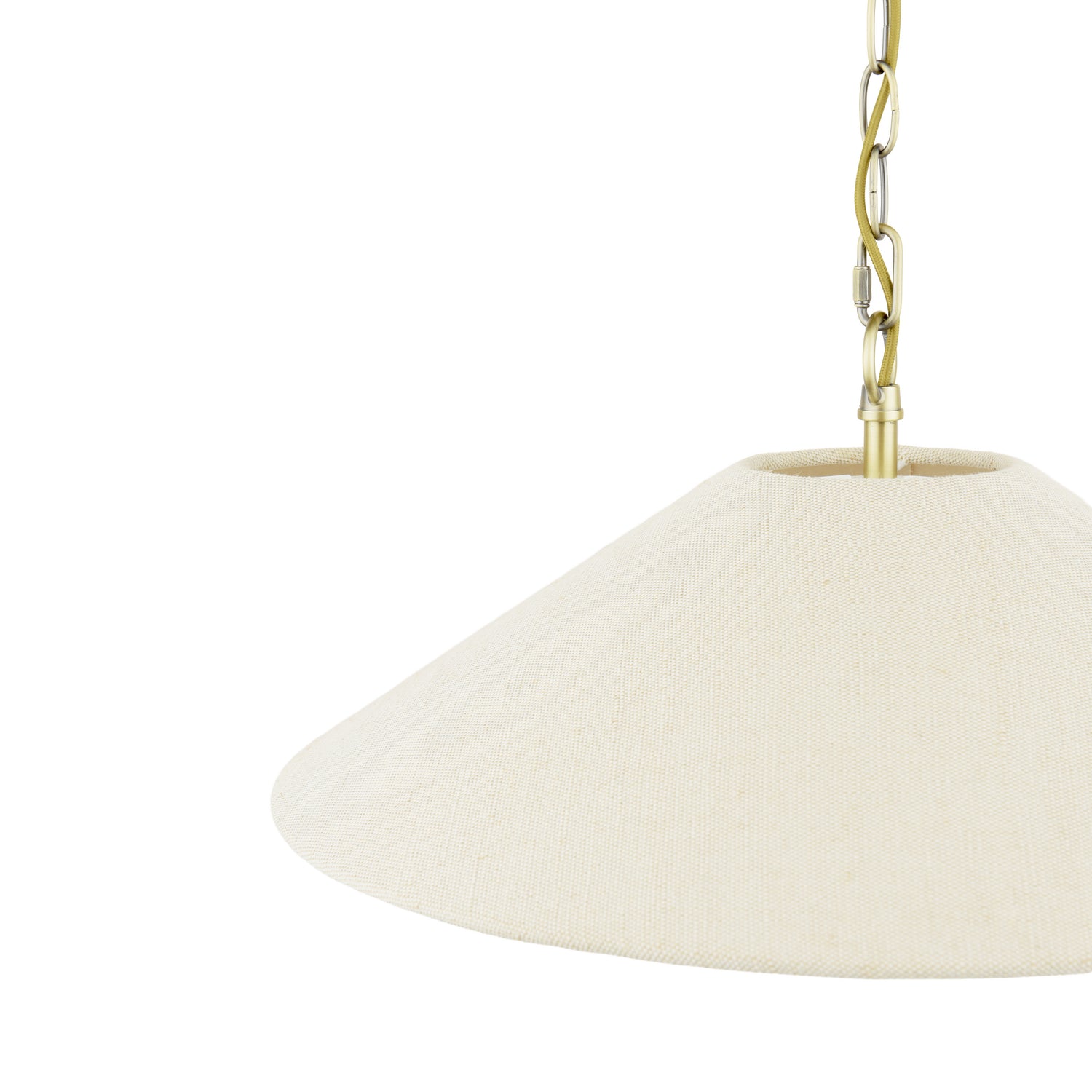 - Harmonious blend – Brass and linen create versatile fixture complementing traditional and contemporary décor