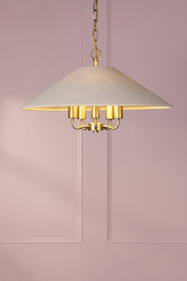 The Laura Ashley Harland 5-light pendant brings timeless sophistication with its matt antique brass finish paired with cream linen coolie shade. Featuring vintage-inspired charm with classic design, this stunning pendant creates warm, inviting illumination perfect for dining rooms, entryways, and living spaces, combining elegant statement with functional lighting that adds atmospheric character to traditional and contemporary interiors.