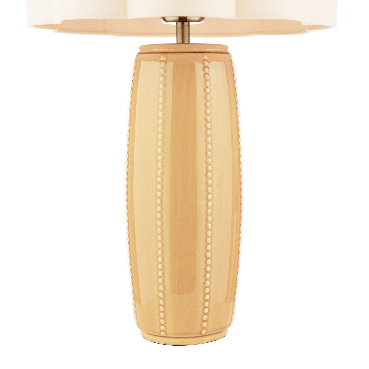 Crafted by Laura Ashley with attention to traditional detailing, the Littleton lamp showcases charming design with rich ochre ceramic base featuring distinctive crackle glaze finish, antique brass metalwork, and natural cotton mix scalloped shade. Signature blend of traditional craftsmanship and contemporary style with harmonious proportions. Complete with shade for immediate use. Requires 1 x E27 bulb (not included, max 60W, LED E27 recommended).