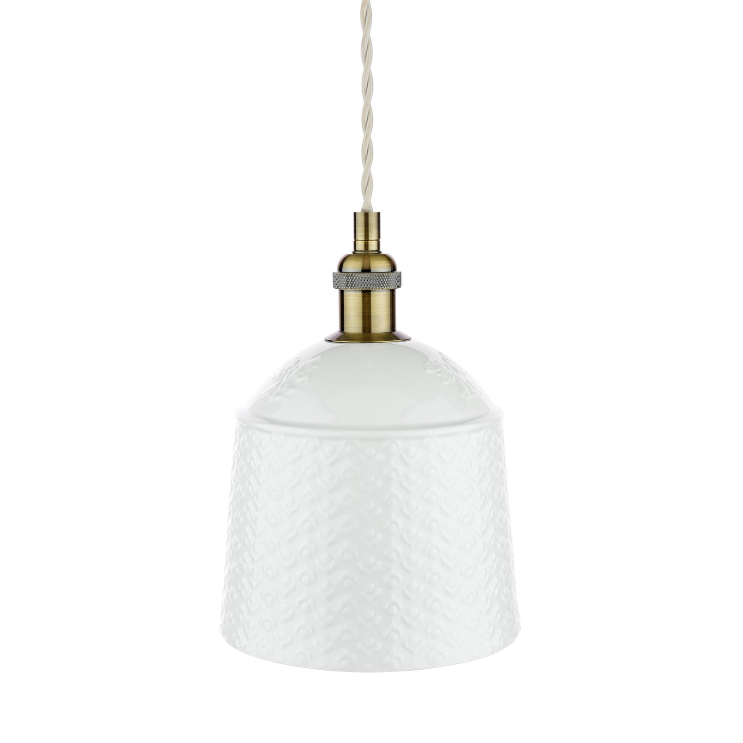 The Laura Ashley Porcelain pendant brings understated elegance with its cream-coloured patterned porcelain shade paired with antique brass detailing. Featuring intricate styling with adjustable height, this enchanting single pendant creates soft filtered illumination casting delicate shadows perfect for reading nooks, dining areas, and intimate spaces, combining sophisticated design with functional lighting that adds refined character to contemporary and traditional interiors.