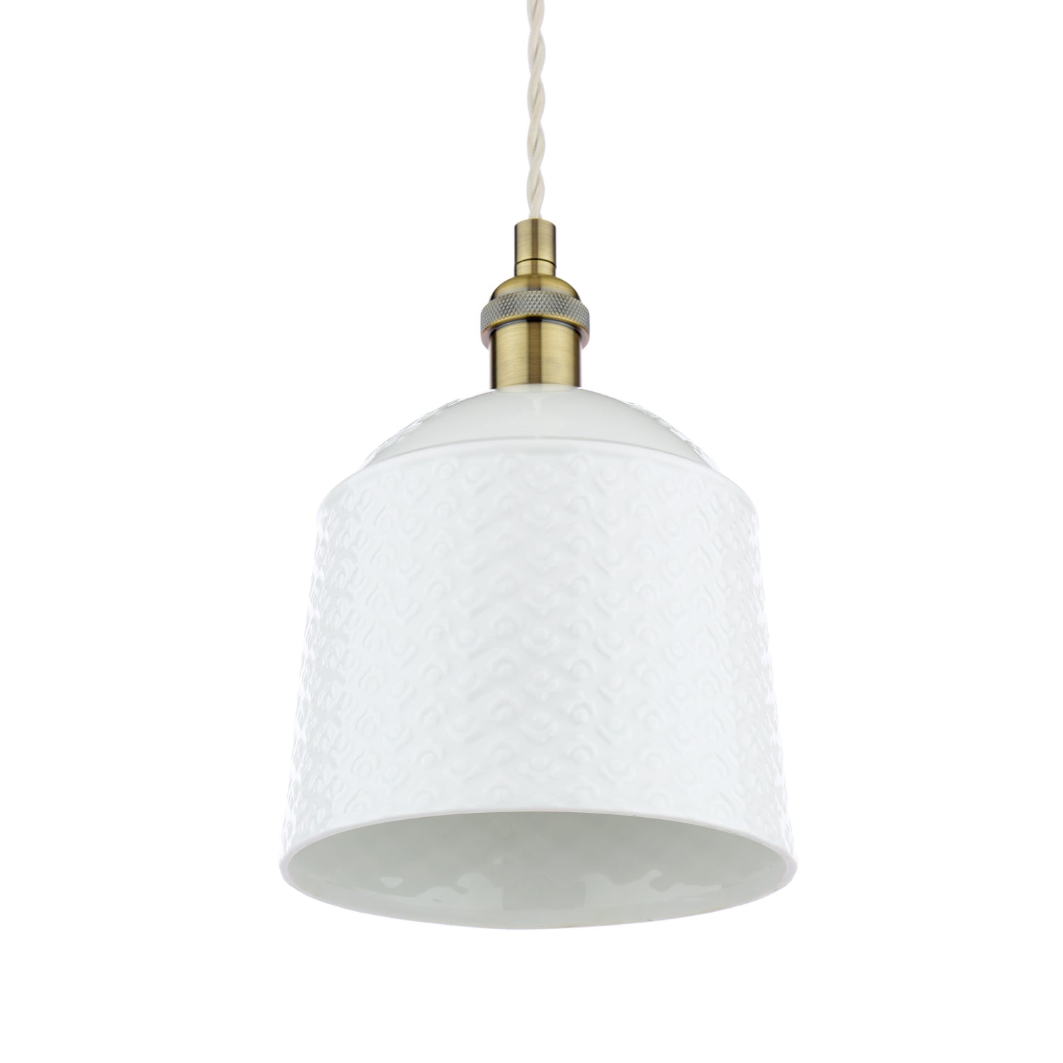 The Porcelain pendant excels in reading nooks where soft light creates inviting atmosphere, in dining areas where patterned porcelain adds warmth, or in intimate spaces where delicate shadows provide enchanting illumination. The cream and antique brass combination works beautifully in contemporary interiors, traditional homes, cosy reading corners, and spaces seeking versatile pendant lighting with understated elegance and sophisticated styling.