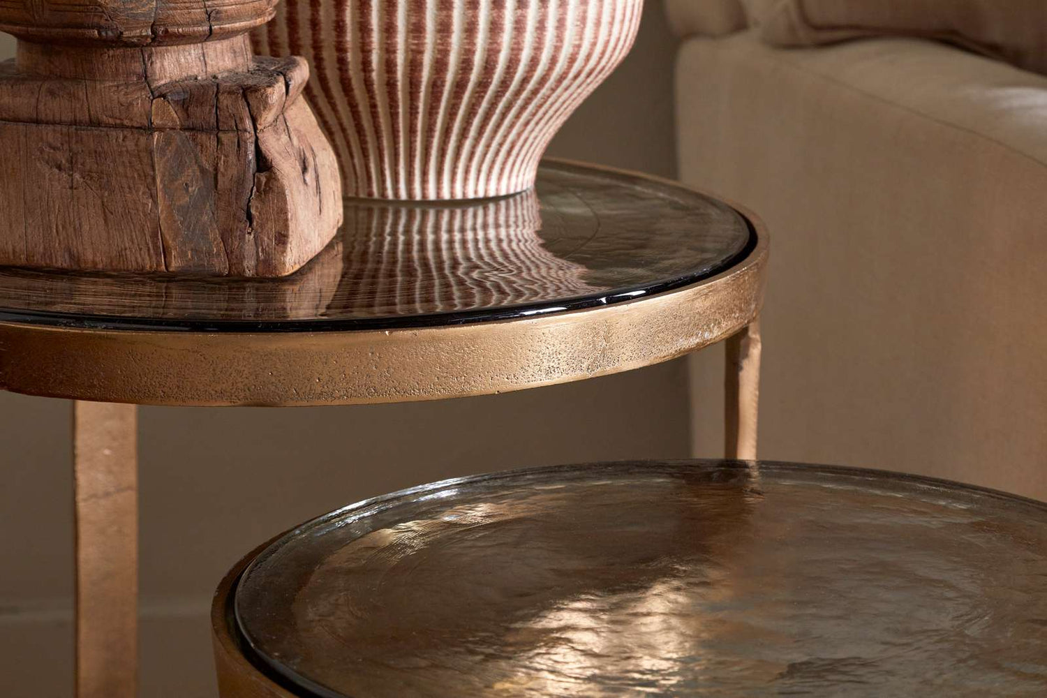 These elegant nesting tables combine form and function with their compact, space-saving design. Each table features a hammered aluminium frame with an antique brass finish, paired with a glass top that adds lightness and contrast. The textured, organic shape gives them a sculptural quality, while the imperfect finish adds depth and character. Perfect as a pair or styled separately, they bring a refined, tactile touch to any room.