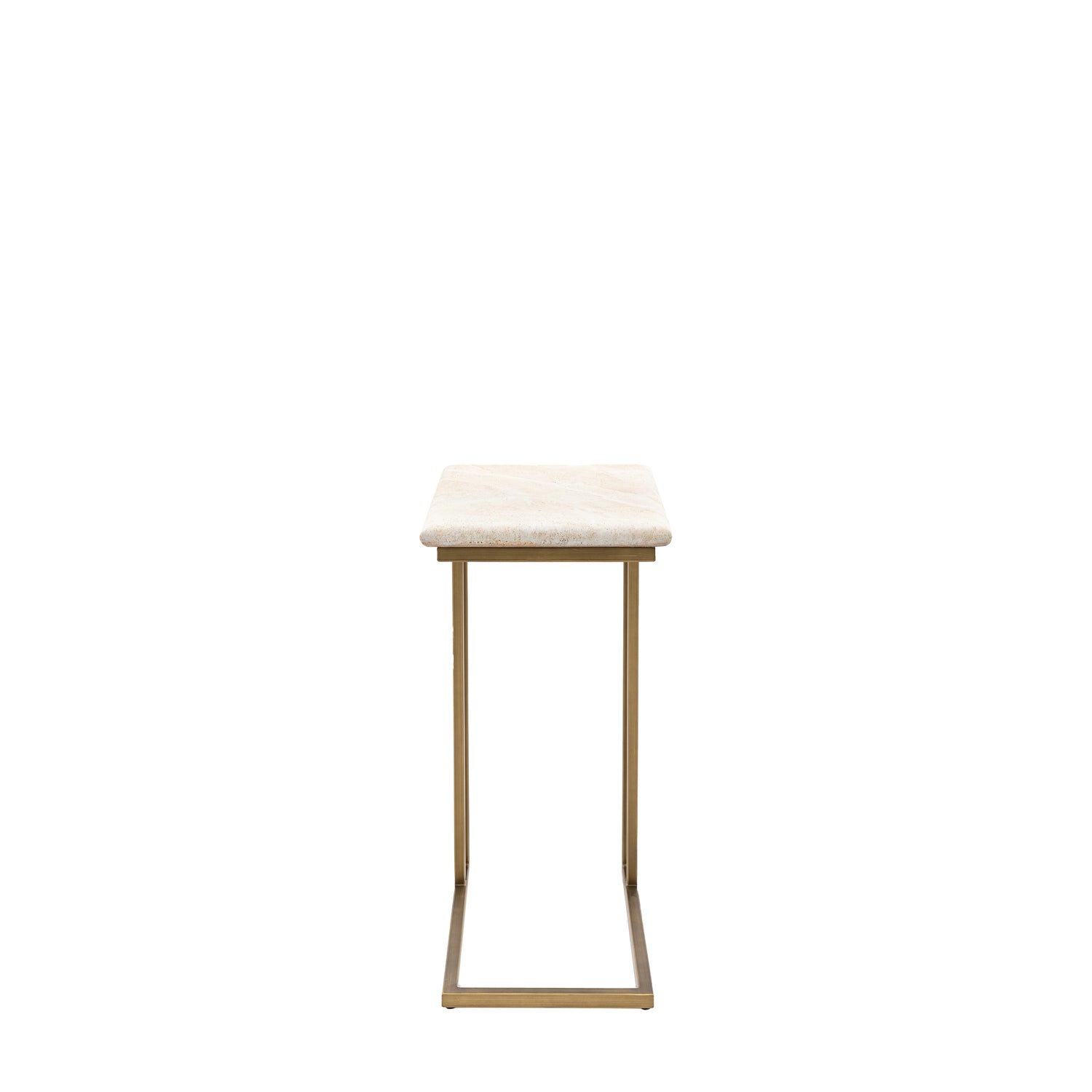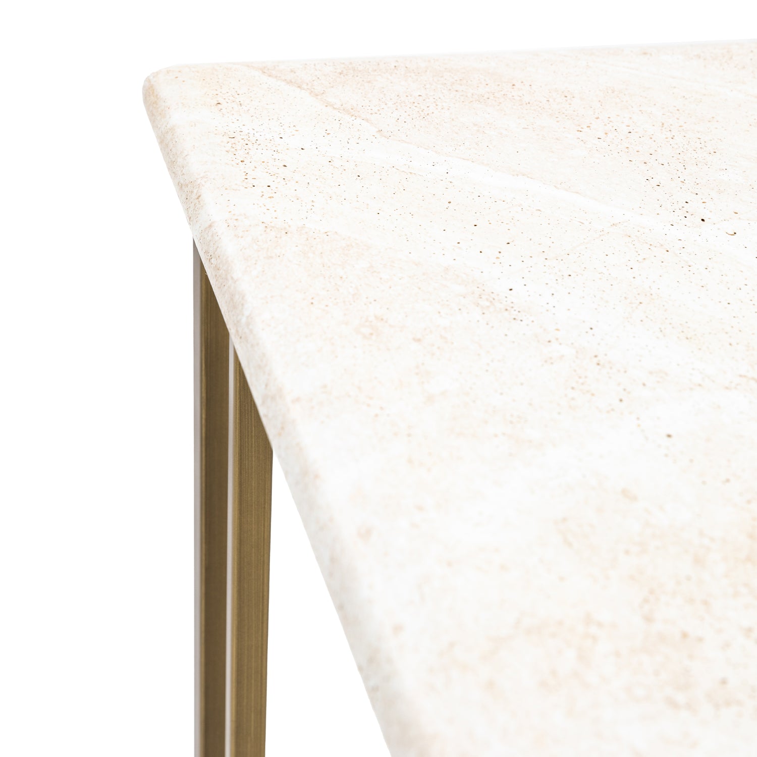 This lovely supper table will add a touch of sophisticated elegance to a room. The top features the most amazing travertine faux finish which is created with the latest state of the art technology to give the look and feel of the real thing but without the weight and technical difficulties. The faux travertine is perfectly complemented by the metal base which has a classy bronzed brass finish, to give an understated luxury style, perfect for any classic modern interior. Matching items also available.