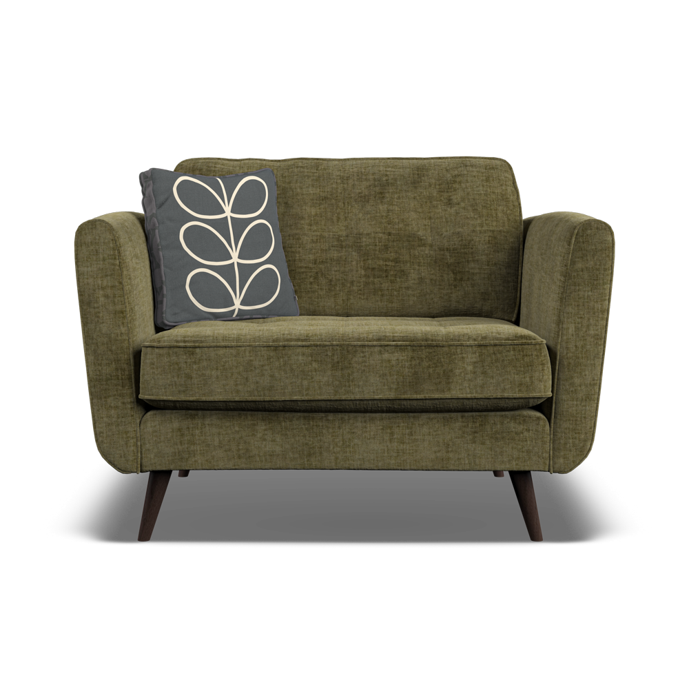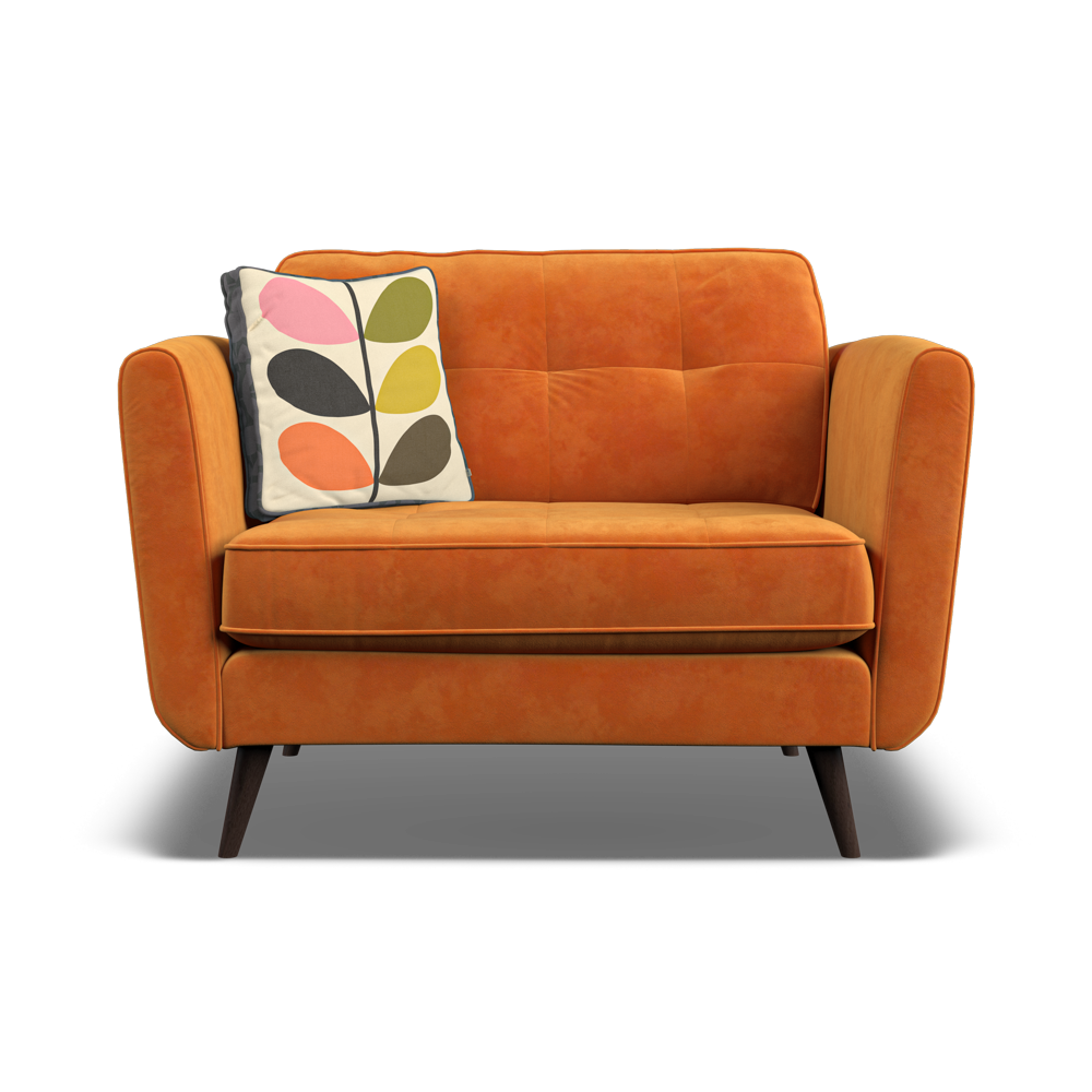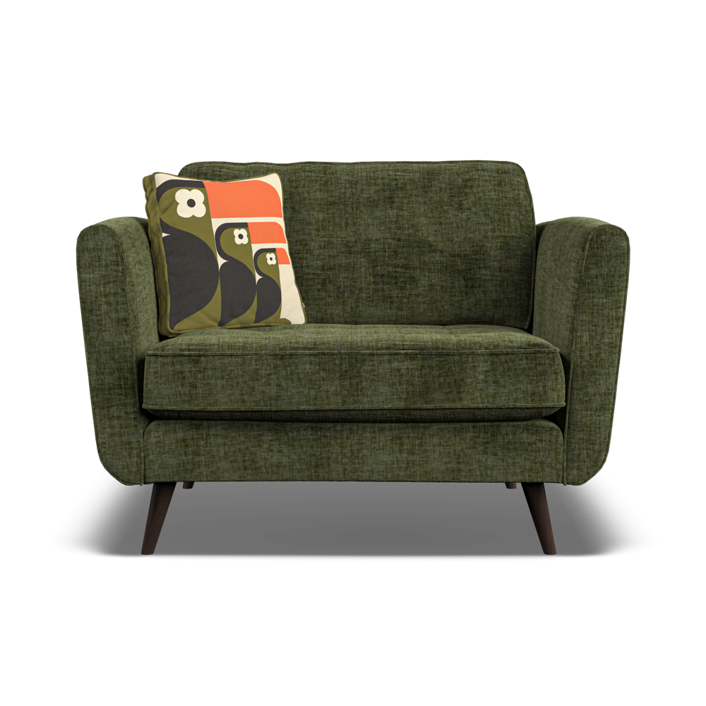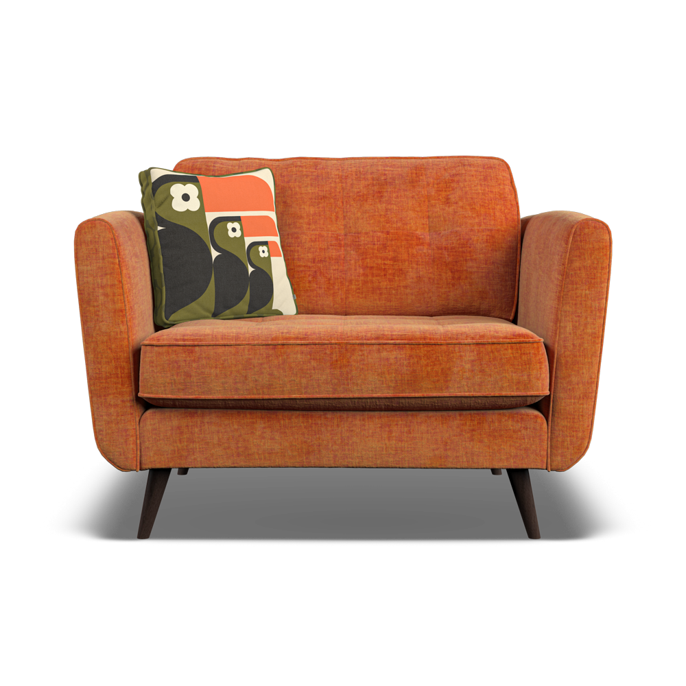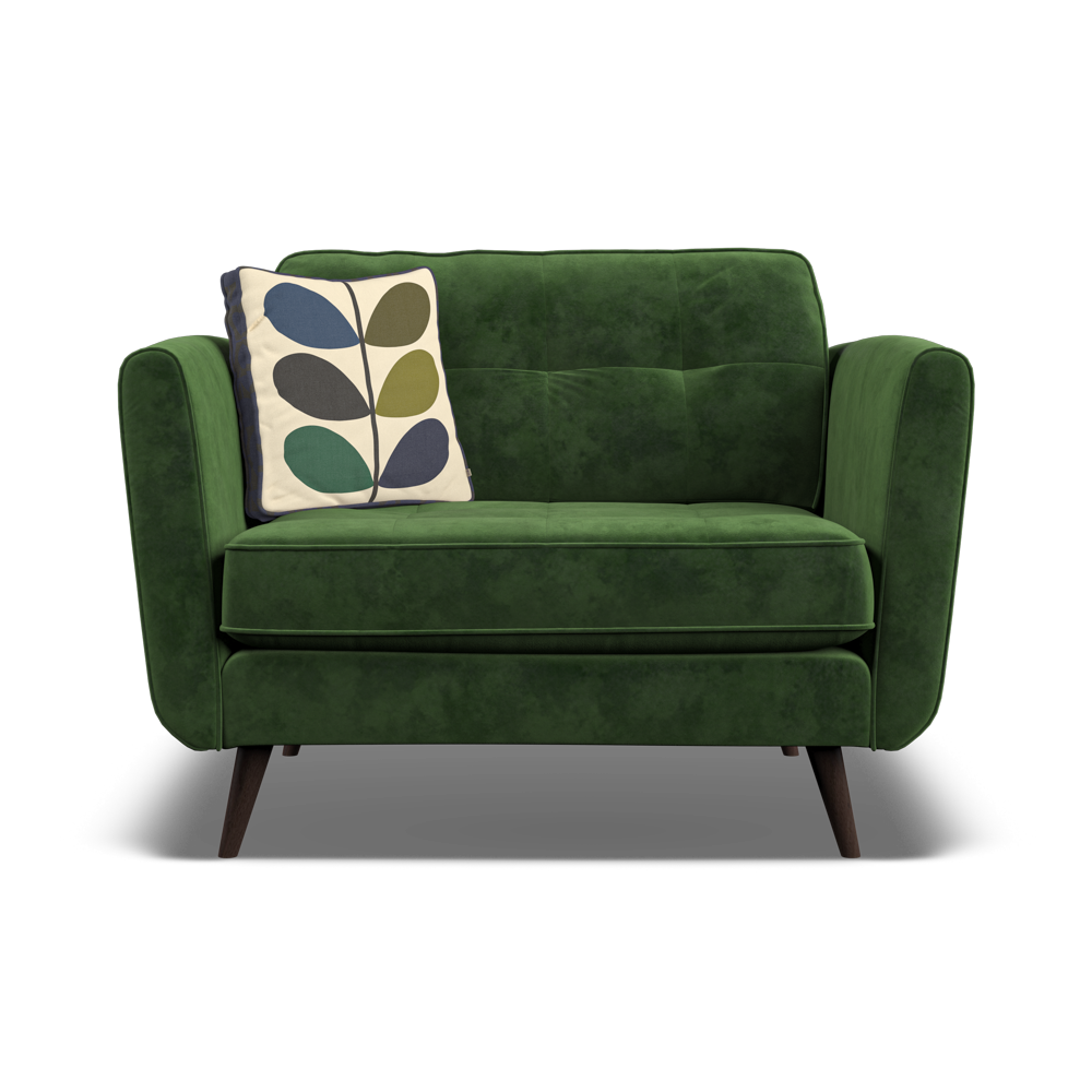 The Ivy Snuggler Chair has clean retro lines with soft rounded arms. The seat and back cushions have been finished with an elegant square quilted surface design and perfectly piped seams. A perfect combination of contemporary design and retro style. The feet colour can either be finished in Weathered Oak or Walnut stain.