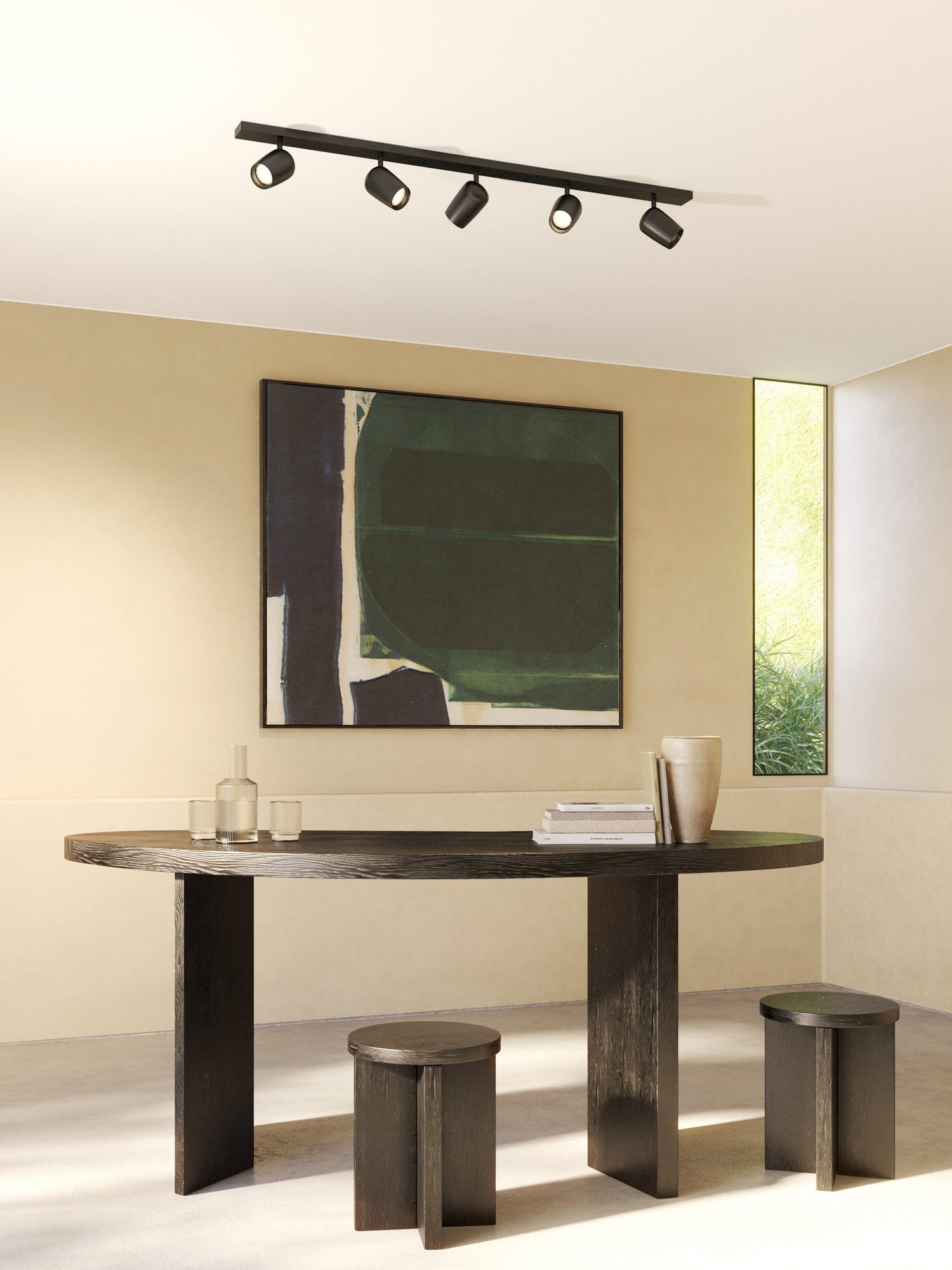 With its five curved spotlight heads arranged along a straight bar, Koto is the perfect choice for adding functional, multidirectional spotlighting to your home. Thanks to its versatile design, Koto's five spotlights can be adjusted individually to focus the light output as desired, making it an ideal lighting solution for kitchens, workspaces, living rooms and beyond.