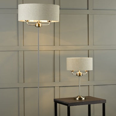 Chic and on-trend, the attractive Sorrento floor light from Laura Ashley boasts three lights on arms, all encased in a single contemporary drum shade in natural slubbed linen with a metallic silver inner. A straight stem rises up from a round, flat base with stepped, Art Deco style, detail.