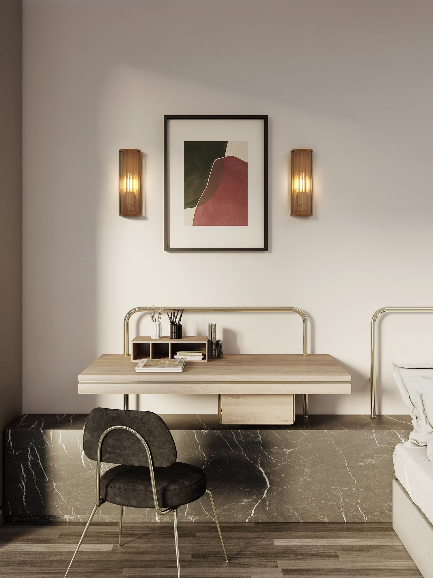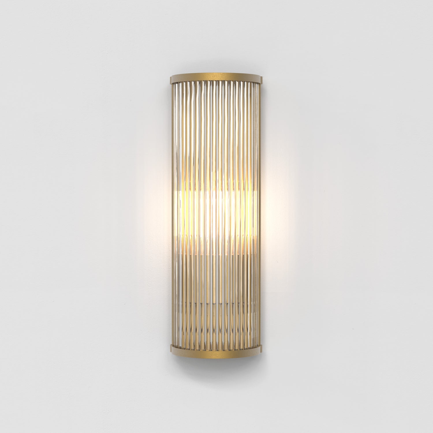 Inspired by Art Deco luminaires, the Avignon Round 375 wall light is large in scale adding instant drama and presence to a space. Tall and slender with a rounded profile, it features sparkling clear glass rods, die-cast antique brass end caps and exudes ambient, glare-free illumination. Designed with hospitality settings in mind, the light fixes to the wall with a single discreet screw, so nothing distracts from its seamless look.