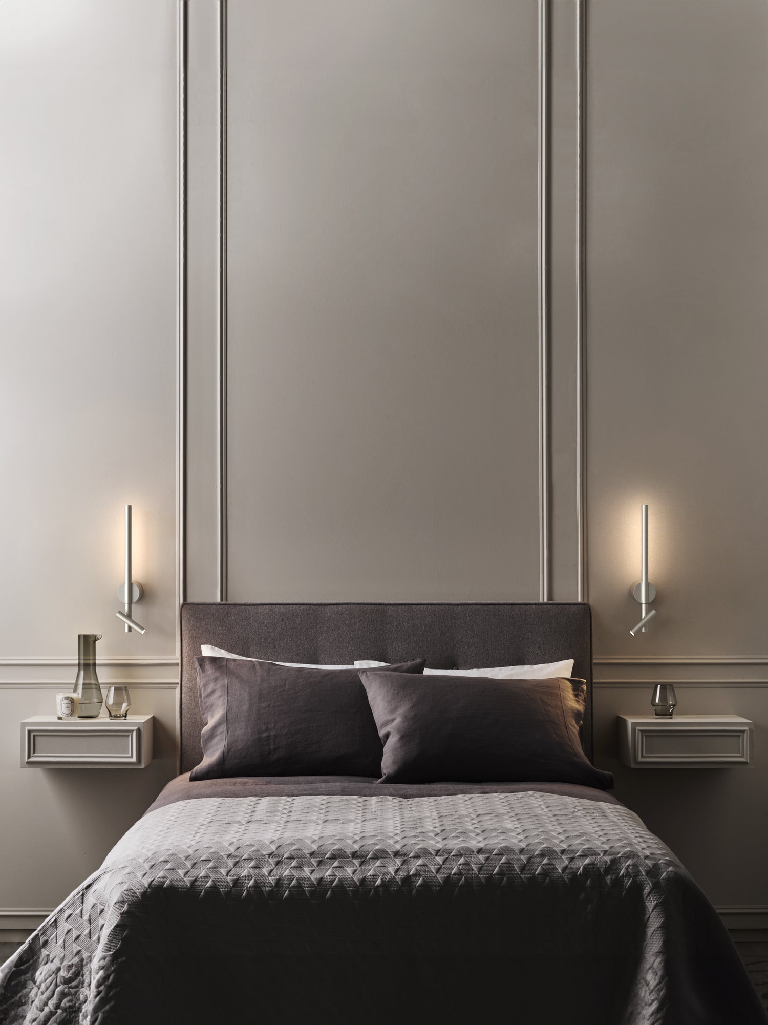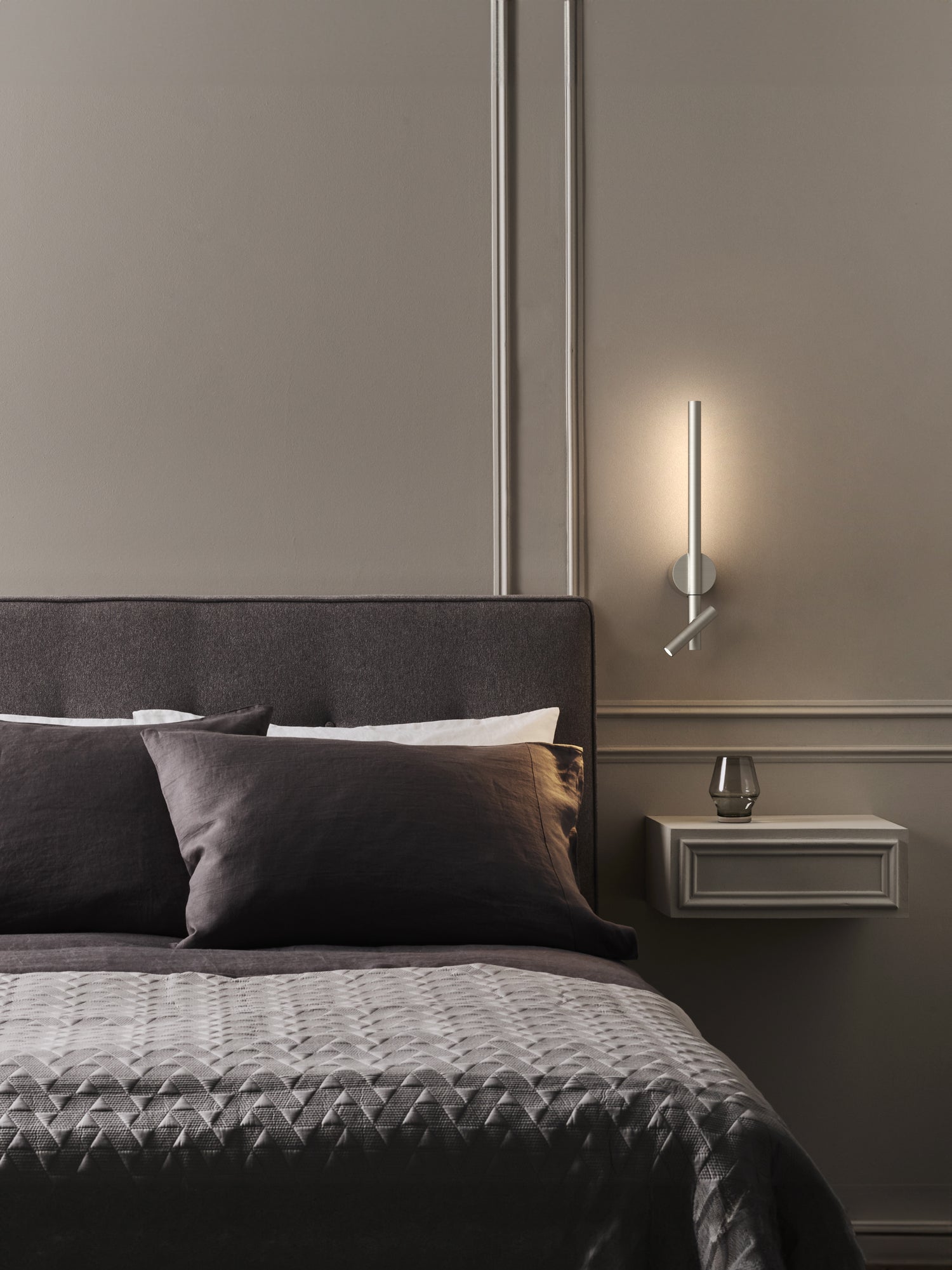 Inspired by the precision and minimalism of a single pencil stroke, Baton is a dual-function bedside wall light with a linear, architectural design. Its two metal lines intersect at harmonious angles, while the opalescent diffuser casts a gentle, ambient glow. Designed with versatility in mind, Baton can be mounted either horizontally or vertically.