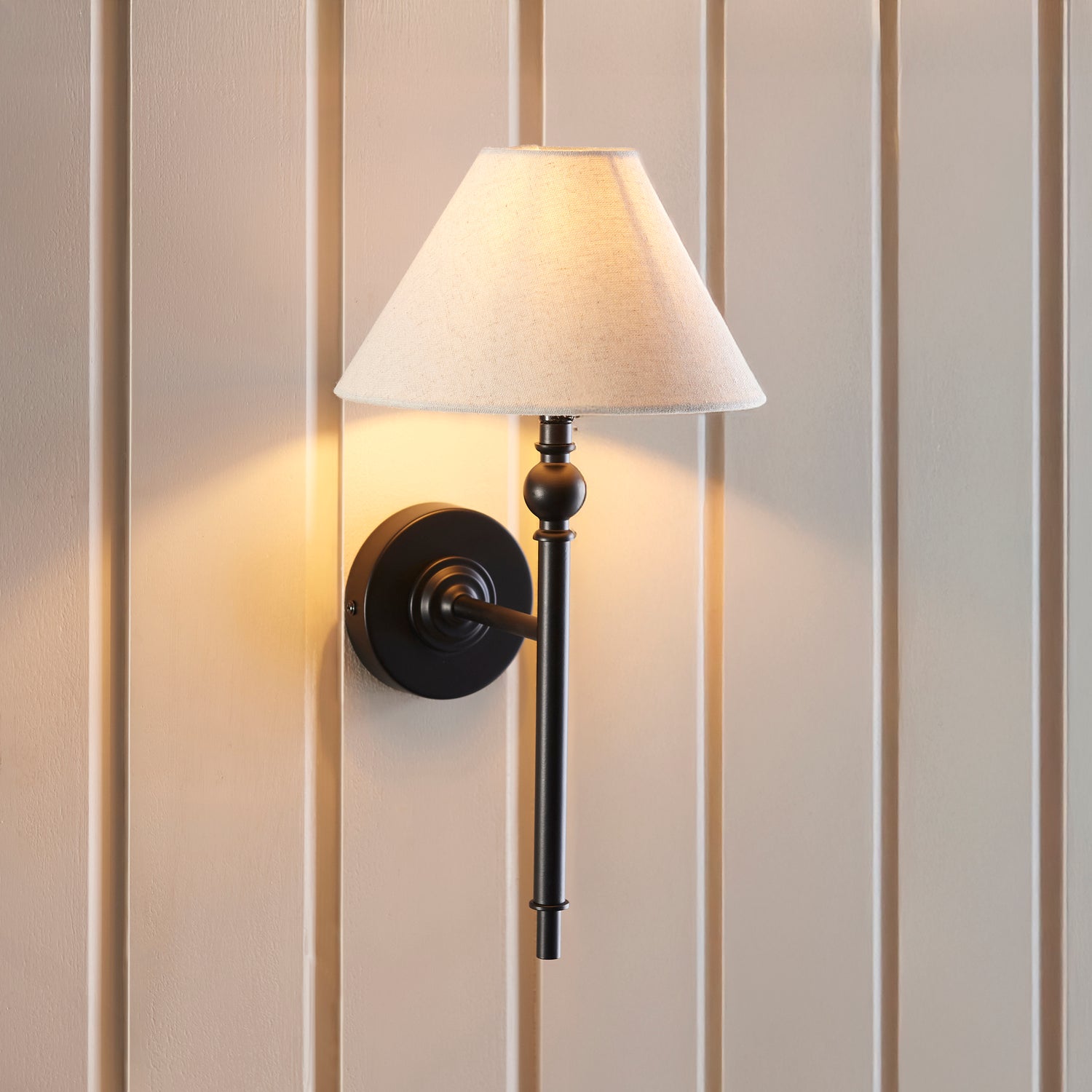 This elegant wall light is finished in matt black and features a timeless tapered shade in natural linen mix fabric. Complete with a B22 lamp holder for an authentic classic look, making it a wall light to be proud of. Matching items available. . Perfect for elevating your interiors, this piece blends timeless design with contemporary sophistication to create a stunning focal point.