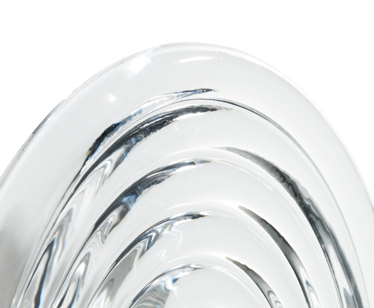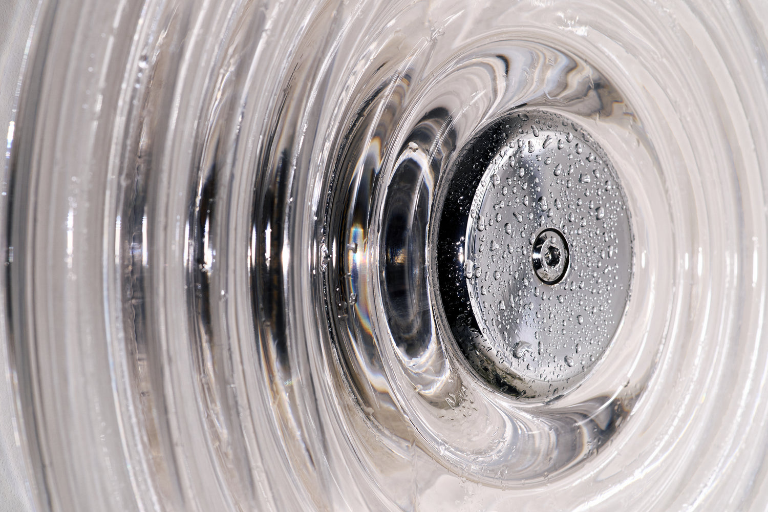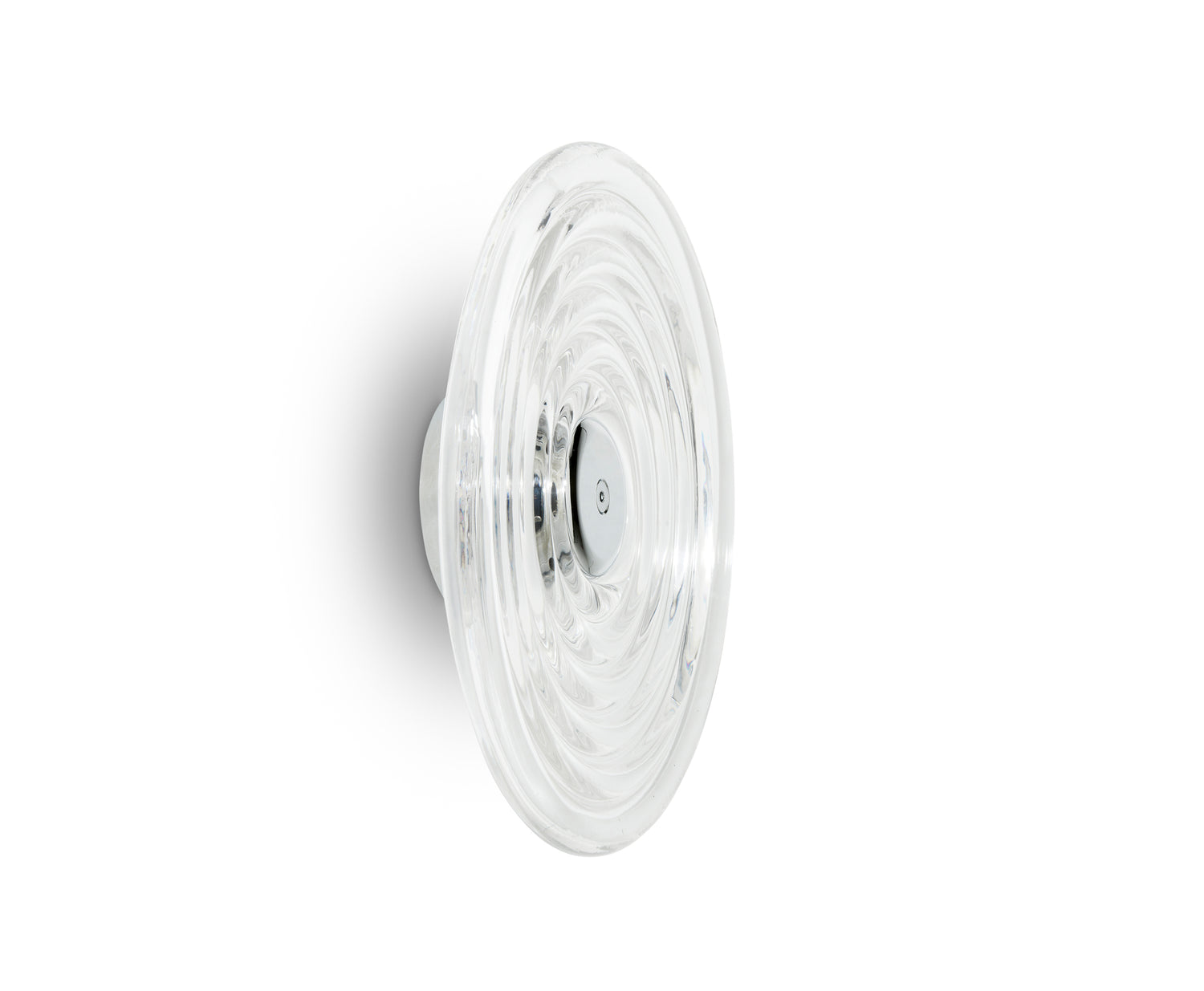 Press is a series of lights made from the thickest and most transparent glass with a satisfyingly rounded linear surface detail. The shapes are reminiscent of shipping buoys and children's toys. The ribbed glass creates diffusion of the light source and projects linear and stripy patterns. Bold in silhouette and simple in function, Press is manufactured by dropping massive globs of molten glass at 1,200 degrees centigrade, pressed in iron moulds under tons of pressure to create immensely durable lights.