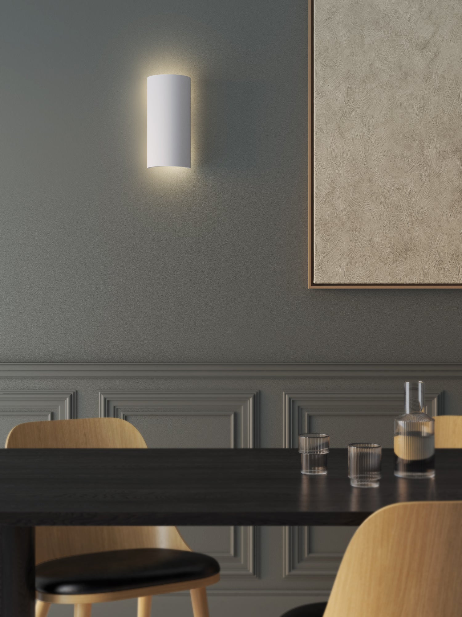 Available in two sizes, the Comino wall light can be tailored to suit different spaces and design requirements. Its smooth, clean lines and paintable plaster finish allow for easy integration into any interior scheme, whether left natural or customized to match your décor.