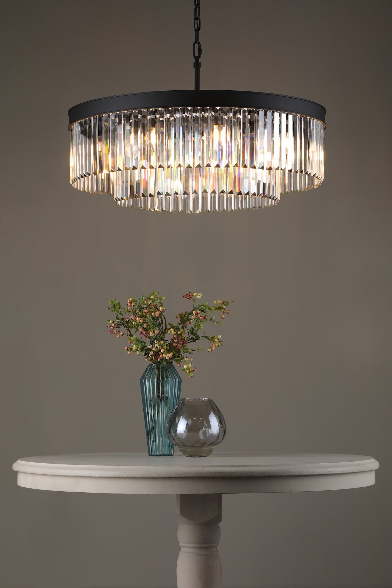 The Celeus 8-light pendant chandelier excels in large living rooms with high ceilings where satin black adds contemporary sophistication, above dining tables where faceted glass provides dramatic illumination, or in grand interiors where impressive proportions create commanding focal points. The satin black and glass combination works beautifully in contemporary interiors, spacious living rooms, elegant dining rooms, and traditional homes seeking premium grand statement chandelier lighting with sophisticated metalwork and glass detailing.