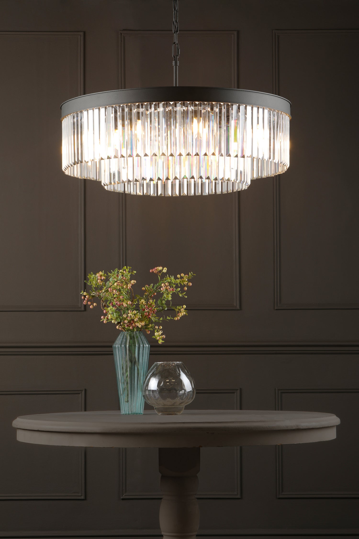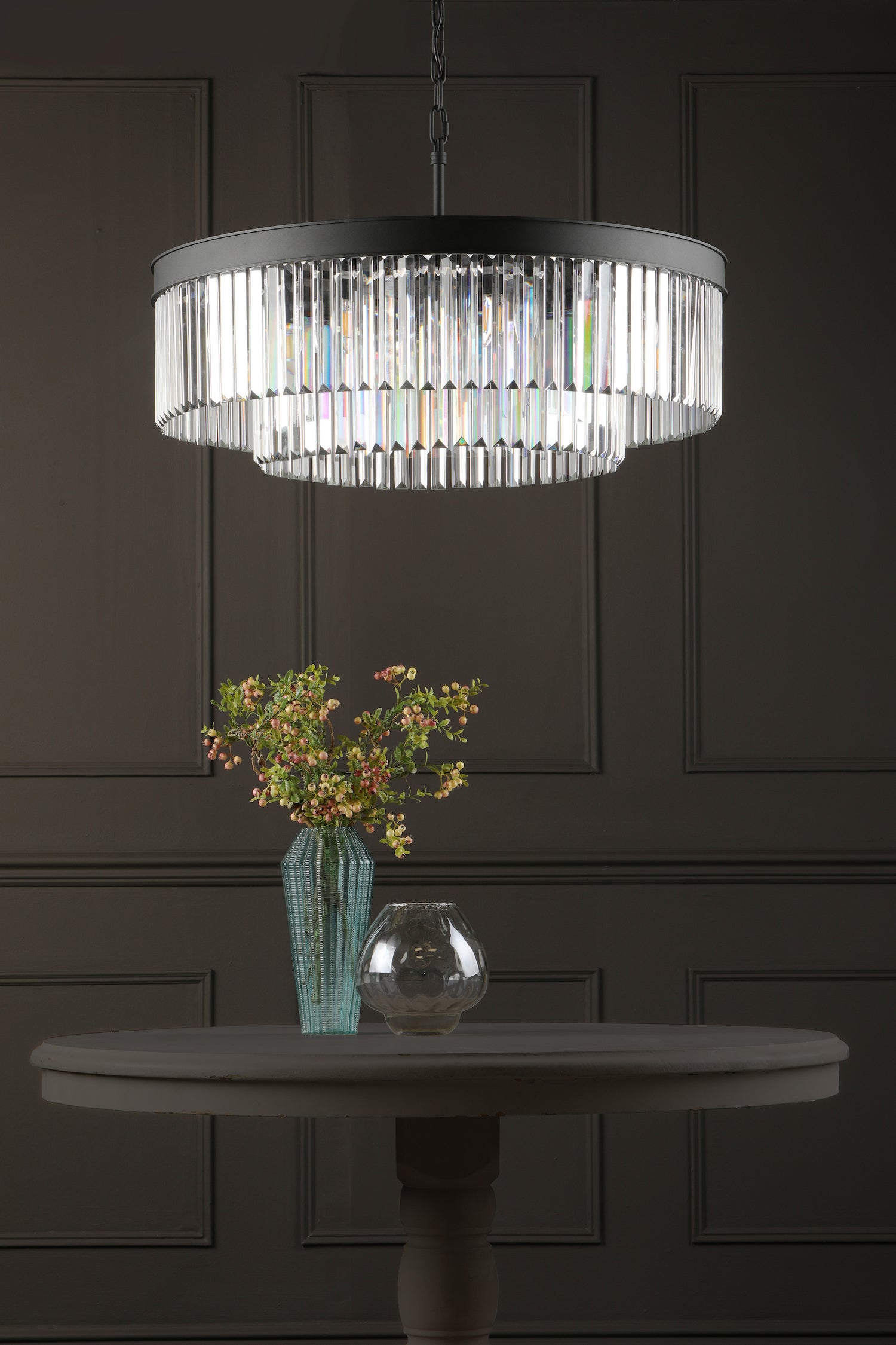 Crafted by Dar with attention to premium detailing, the Celeus grand pendant chandelier showcases luxurious design with satin black metalwork and exquisite faceted glass elements. The extensive adjustable height (68-250cm) suits high ceilings while the impressive 80cm diameter creates dramatic statement impact. The faceted glass creates mesmerising light refraction effects. Substantial 17kg weight reflects premium quality construction. Dimmable for mood lighting. Requires 8 x E14 bulbs (not included, max 40W each, LED E14 4w recommended).