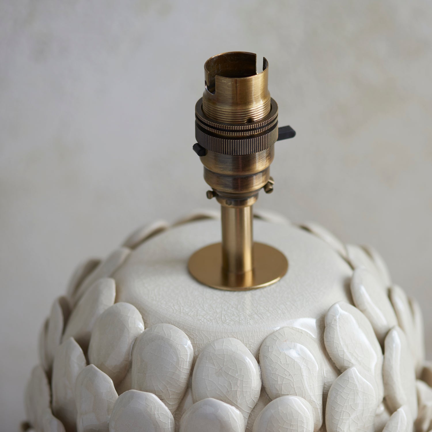 A beautifully organic shaped ceramic table light base, decorated with handmade leaf shaped details and brushed aged brass switched B22 lamp holder. Pair with one of our decorative fabric or raffia shades to complete the look.. Perfect for elevating your interiors, this piece blends timeless design with contemporary sophistication to create a stunning focal point.