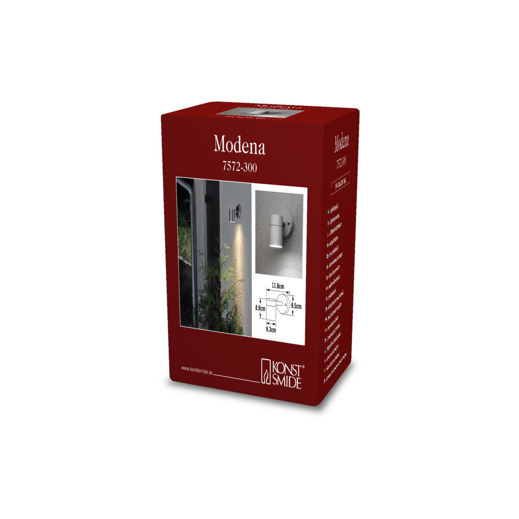 The Konstsmide Modena Outdoor Wall Light is a contemporary and stylish addition to any outdoor living space. It features a sleek, grey finish and is designed to withstand the elements. This modern fixture is made from durable aluminum and glass, and is perfect for illuminating your outdoor area. The wall light is IP44 rated, making it weatherproof and safe to use outside. Add an elegant touch to your exterior with the Modena Outdoor Wall Light.