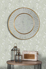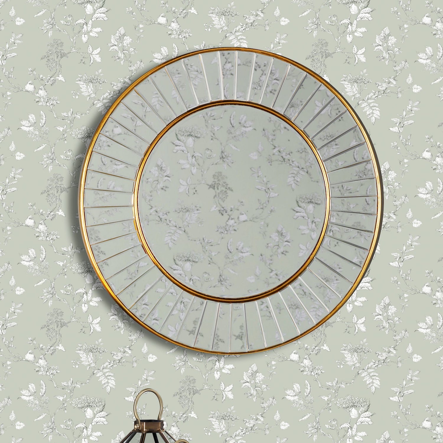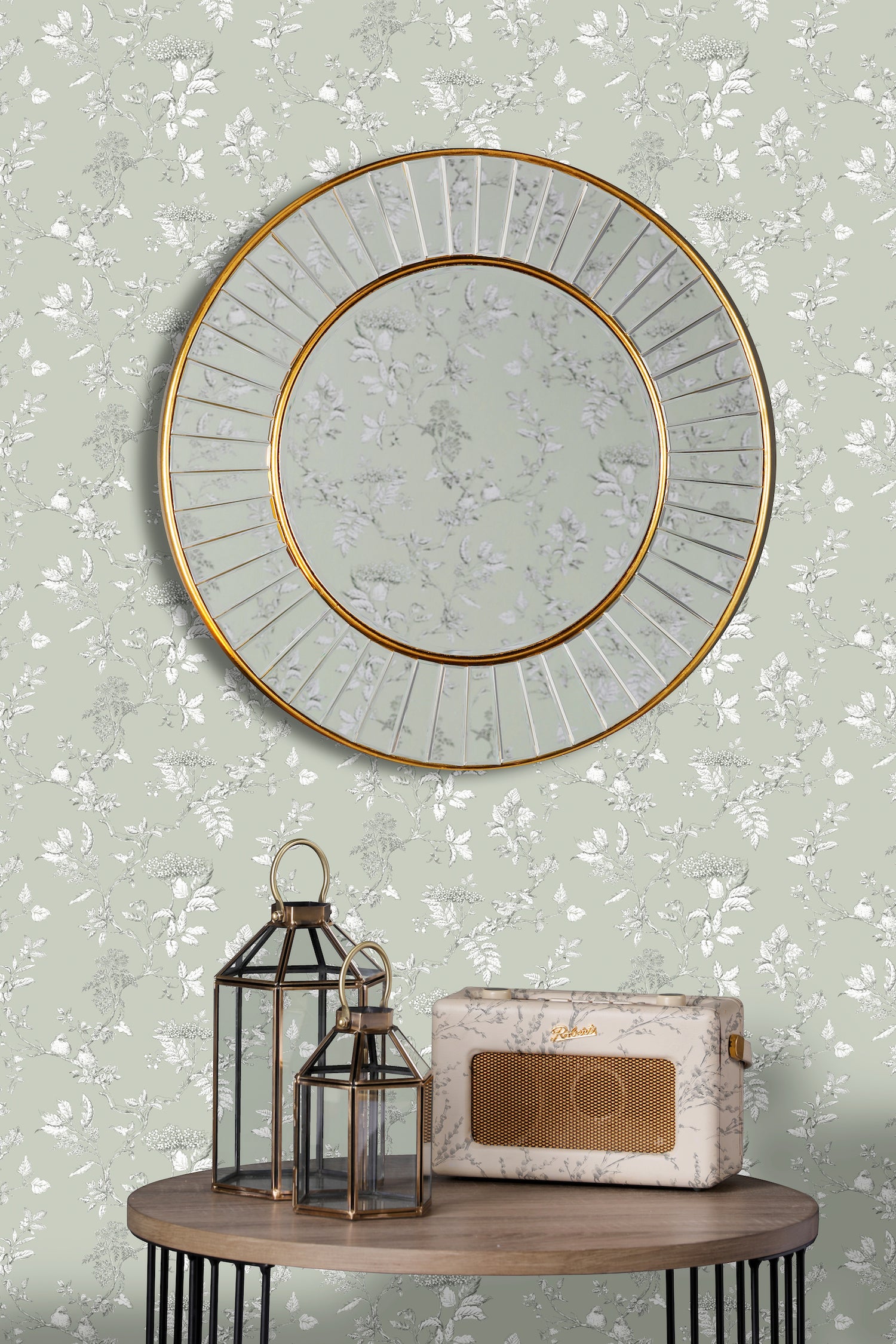 Round gold-framed mirror on pale green floral wallpaper with decorative lantern below