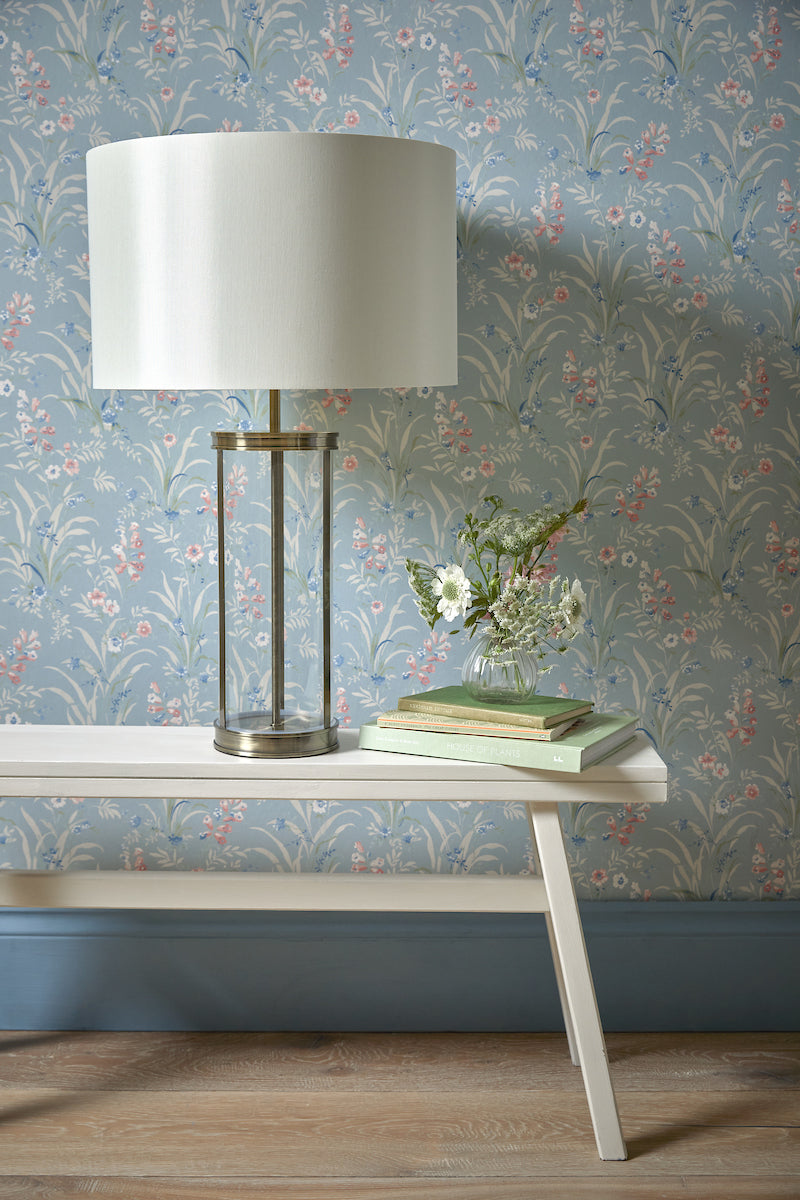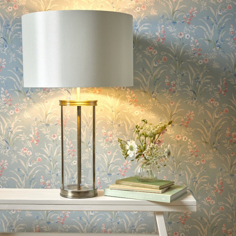 A Laura Ashley Harrington Large Table Lamp with antique brass finish and a white lampshade, displayed against a patterned wallpaper background.