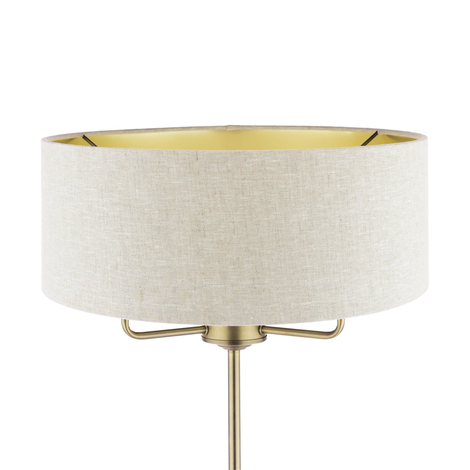 The Laura Ashley Sorrento 3-light floor lamp brings chic contemporary style with its matt antique brass finish paired with single natural linen drum shade featuring metallic inner. Featuring sophisticated styling with elegant design, this versatile floor lamp creates warm, ambient illumination perfect for living rooms, dining areas, and bedrooms, combining modern aesthetics with functional lighting that adds sophisticated atmosphere to contemporary and traditional interiors.
