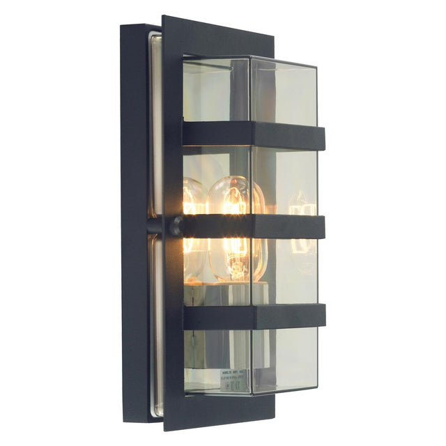 This Norlys Boden Art Deco style outdoor wall lantern in black with clear shade is rated IP54. It features geometric lines and classic design, with rectangular wall mount, shade retainer and clear polycarbonate shade. Horizontal protective steel bands on the outer face add to the geometric Art Deco style.