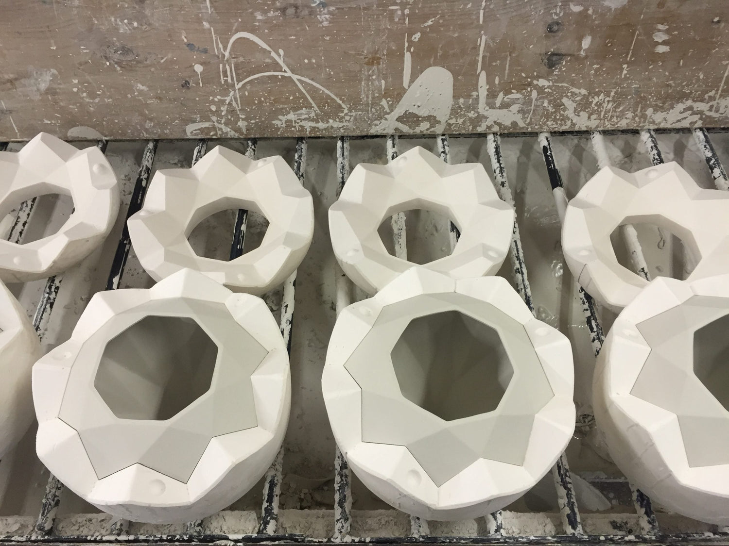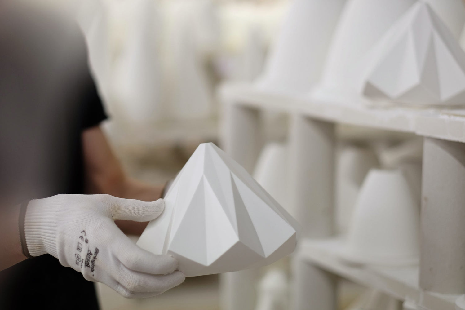 The Hatton 2 Pendant has a beautifully intricate bone china shade. Using a highly skilled process, we have been able to transform bone china into a multi-faceted, symmetrical, gem-like form. When switched 'off' the pendant has an angular sculptural beauty, and when 'on' it provides warm illumination with dramatic lines and shadows.