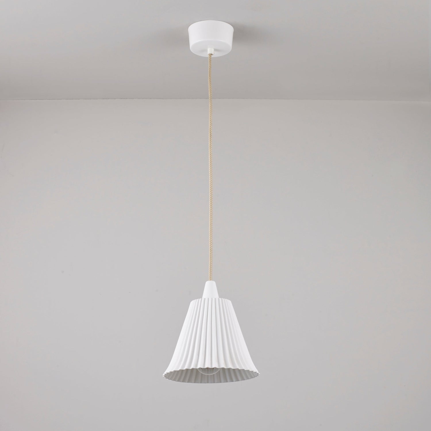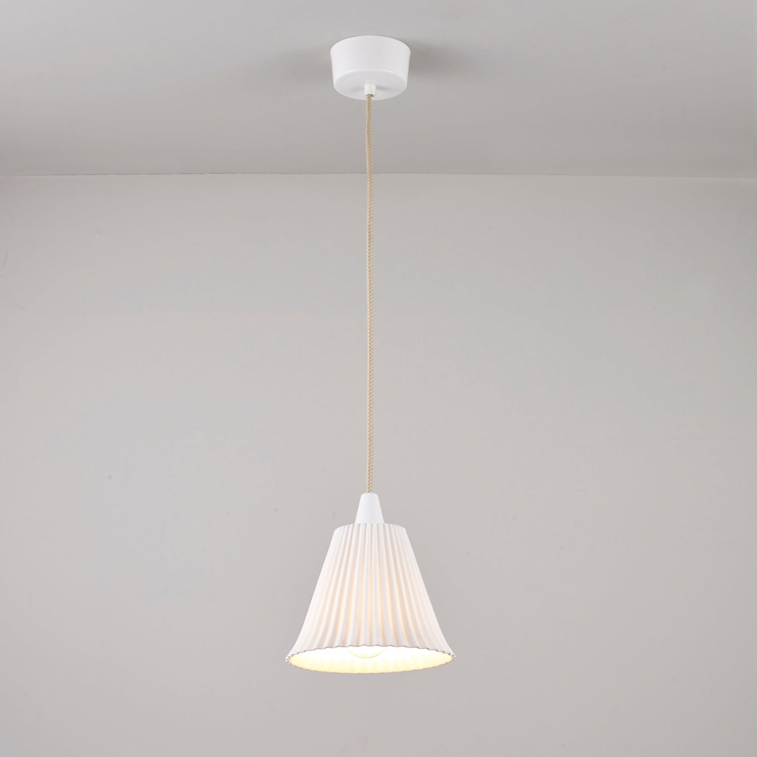 A pleated version of the original Hector design. Skilfully crafted from bone china, the architectural shade of the Hector Pleat offers a warm ambient glow when lit, and is matched beautifully by our signature cotton braided cable.