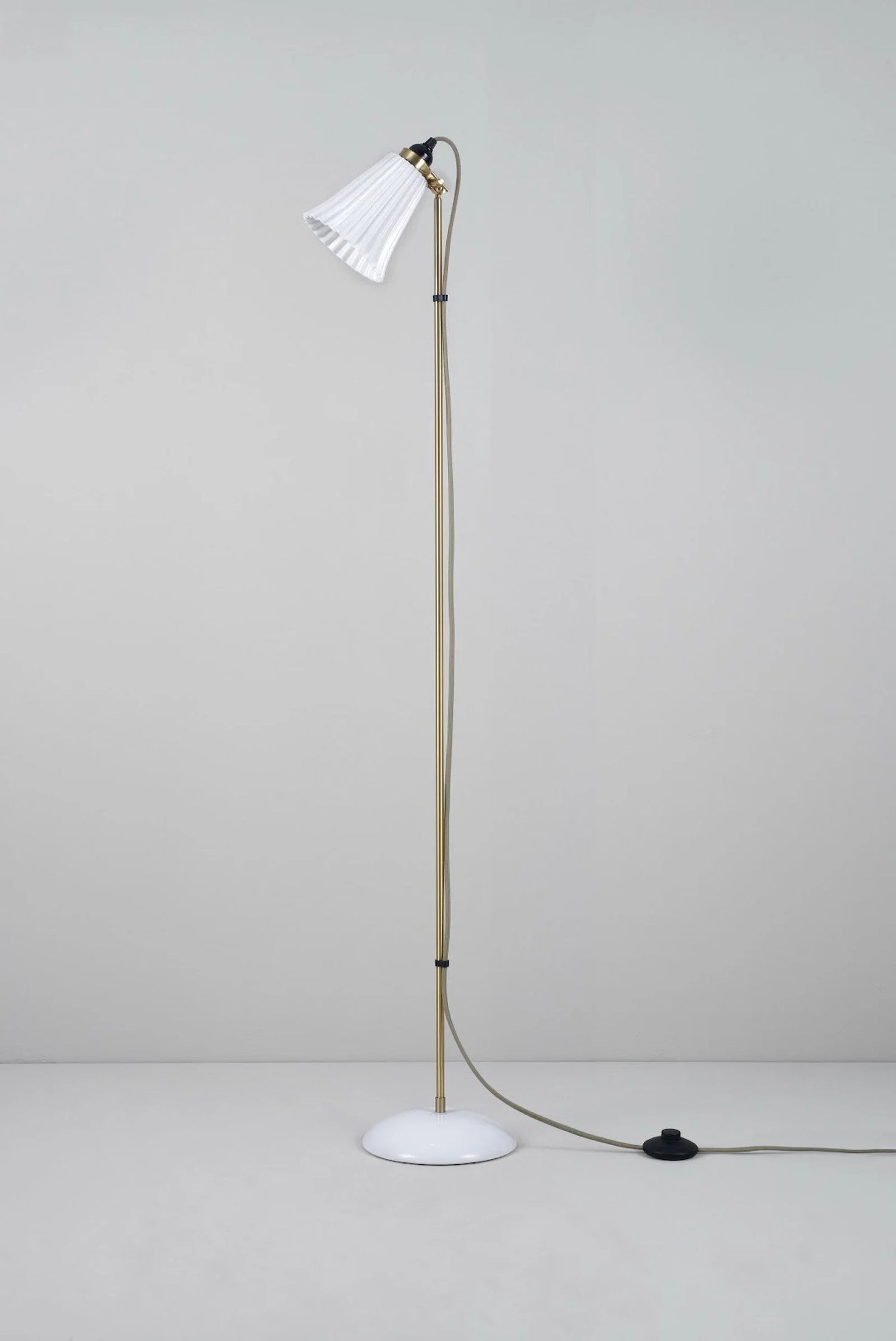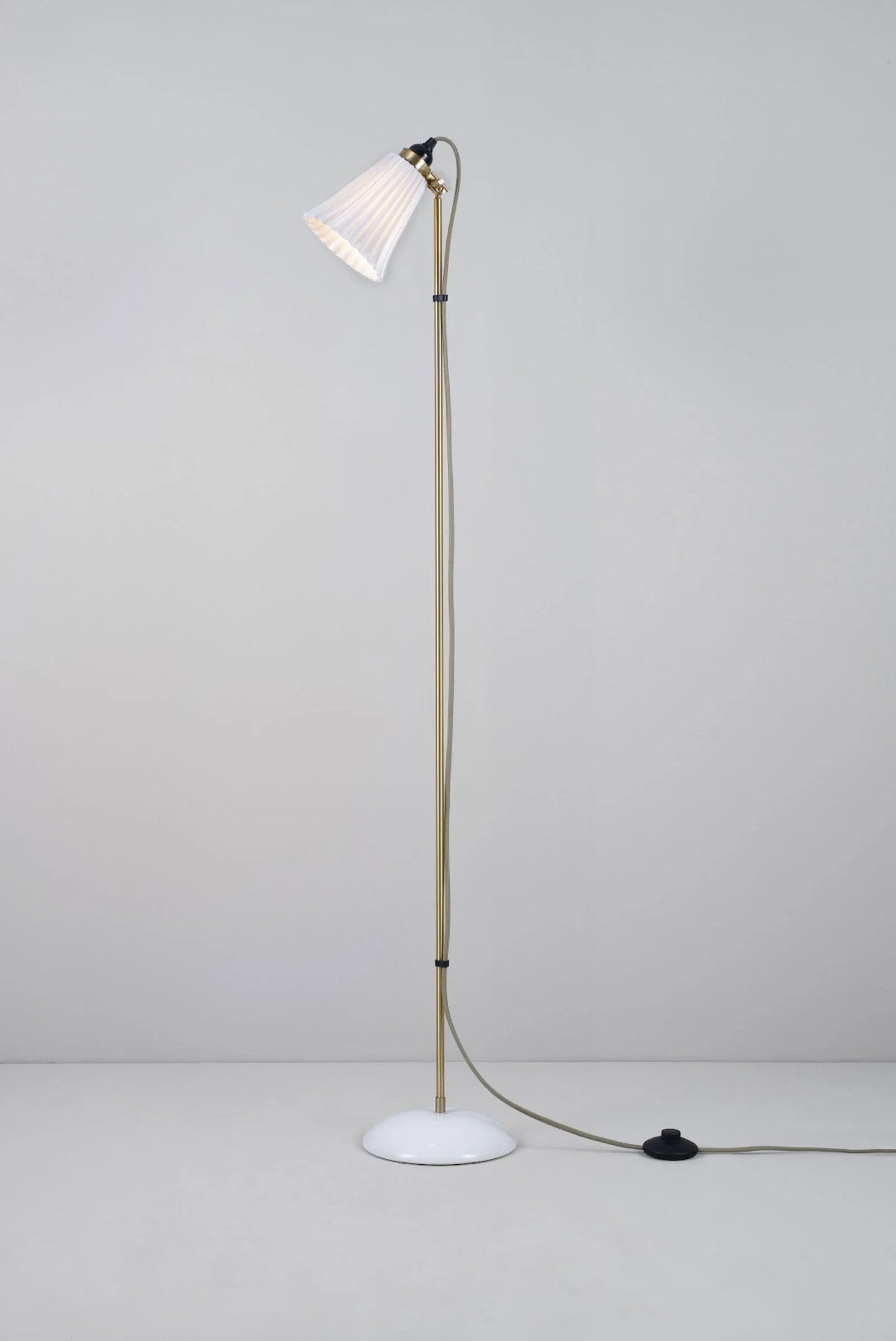 The Original BTC Hector Pleat Medium Floor Light combines expert craftsmanship with refined materials, featuring a pleated shade made from fine bone china paired with sophisticated satin brass accents. Its adjustable clamp lets you precisely direct light, making it both functional and stylish. The glossy bone china finish is beautifully set off by the satin brass details, while the signature cotton braided cable in soft grey adds a subtle, elegant touch. This floor light offers a perfect balance of timeless design and practical lighting.